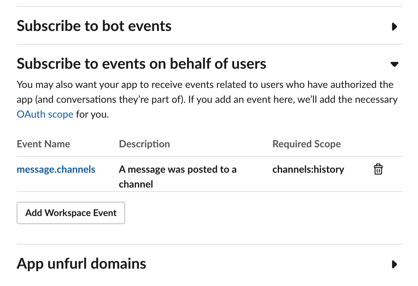 올바른 URL을 입력했다면 Request URL 레이블 오른편에 Verified가 표시됩니다. 그리고 슬랙에서 발생하는 이벤트 중 사용자가 메시지를 포스트한 경우를 Node.js 앱으로 받기 위해 [Subscribe to events on behalf of users]에서 [Add Workspace Event]를 클릭해 준 후 message.channels를 찾아 등록해 줍니다.