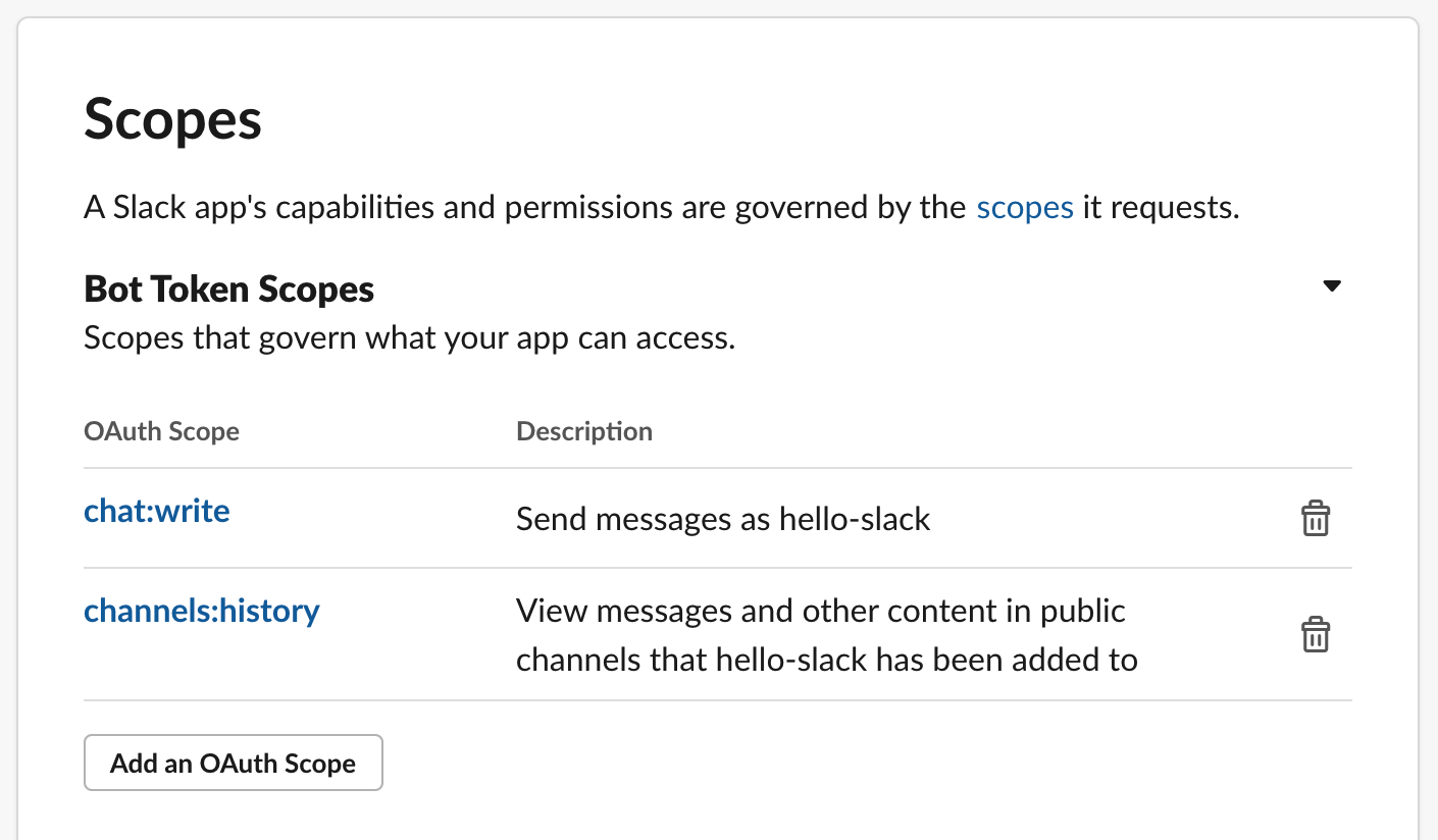 OAuth & Permissions 페이지에서 스크롤을 아래로 내리면 Scopes 섹션이 있고, 이 중 Bot Token Scopes에서 [Add an OAuth Scope]를 클릭해서 chat:write와 channels:history 스코프를 추가해 줍니다.