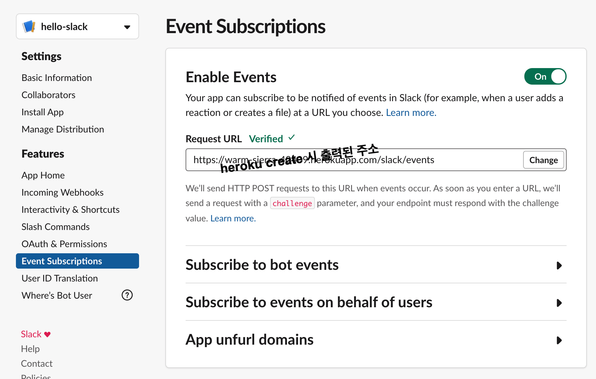 제 경우에는 https://warm-sierra-40409.herokuapp.com/slack/events 를 설정해주었습니다.