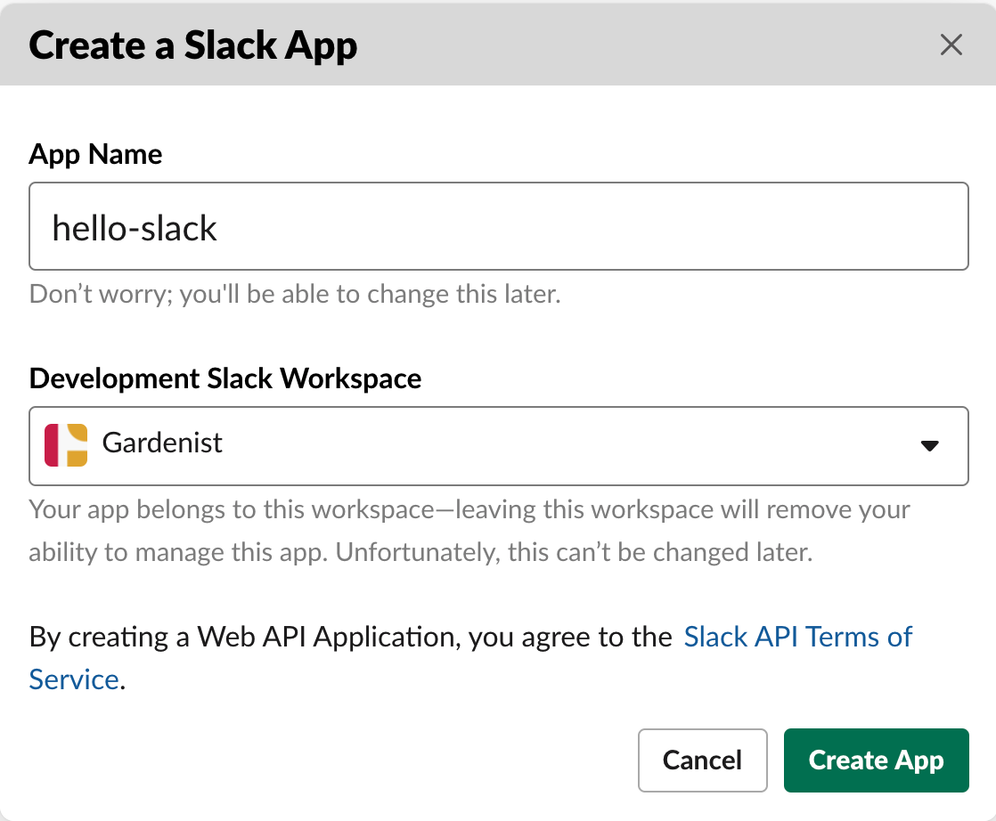 App Name에 슬랙 앱의 이름을 입력하고 Development Slack Workspace는 개발 시 연동할 워크스페이스를 선택해 준 후 [Create App] 버튼을 눌러 앱을 생성해 줍니다.