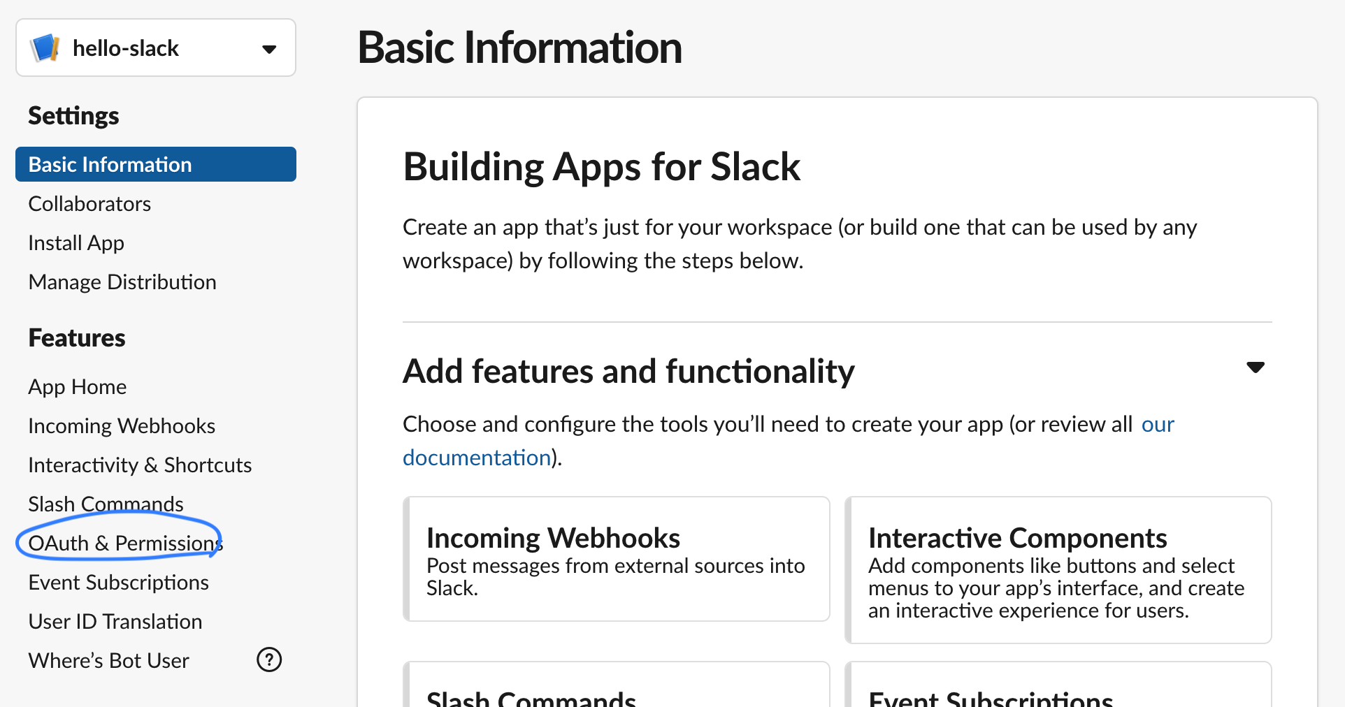 <앱 생성 후 OAuth & Permissions 페이지로 이동하기>